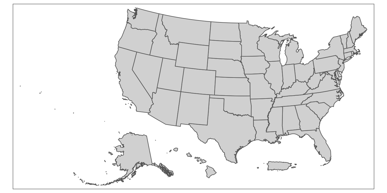 For convenience, we can assign the basic map of the shapefile’s polygons to its own object; here we’ll assign it to an object named usa_map.